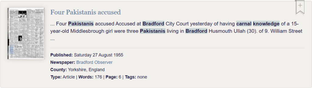 In 1955 4 Pakistani men were accused of having carnal knowledge with a 15yr old girl, for those not familiar with the term canal knowledge it means to have sex with. So, 4 older Pakistani men had sex with a 15yr old girl no doubt at the time it would have been blamed on their victim and not on the Pakistanis.